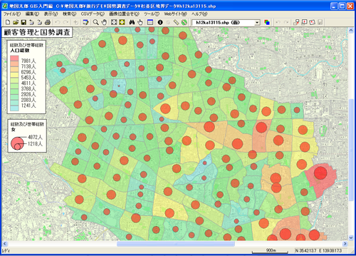 国勢調査のデータやExcel等の表計算のデータと結合することにより、地図上にグラフ・色分け表示して情報を視覚的に表現してビジネスへの有効利用ができます。