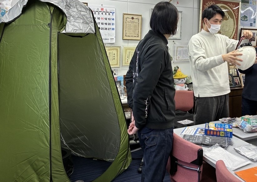 会議室に非常用品や保存食を展示し、内容や使用方法を共有しました。